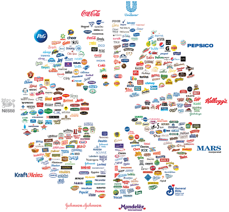 The Illusion of Choice When we shop at the big box stores, we think we have all kinds of choices, with the multitude of brands up and down the aisles, the reality is that most of them are all owned and controlled by just a handful of mega-corporations. Even when you think you are buying natural products, in many cases those "natural" companies have sold out to the giant corporations. |